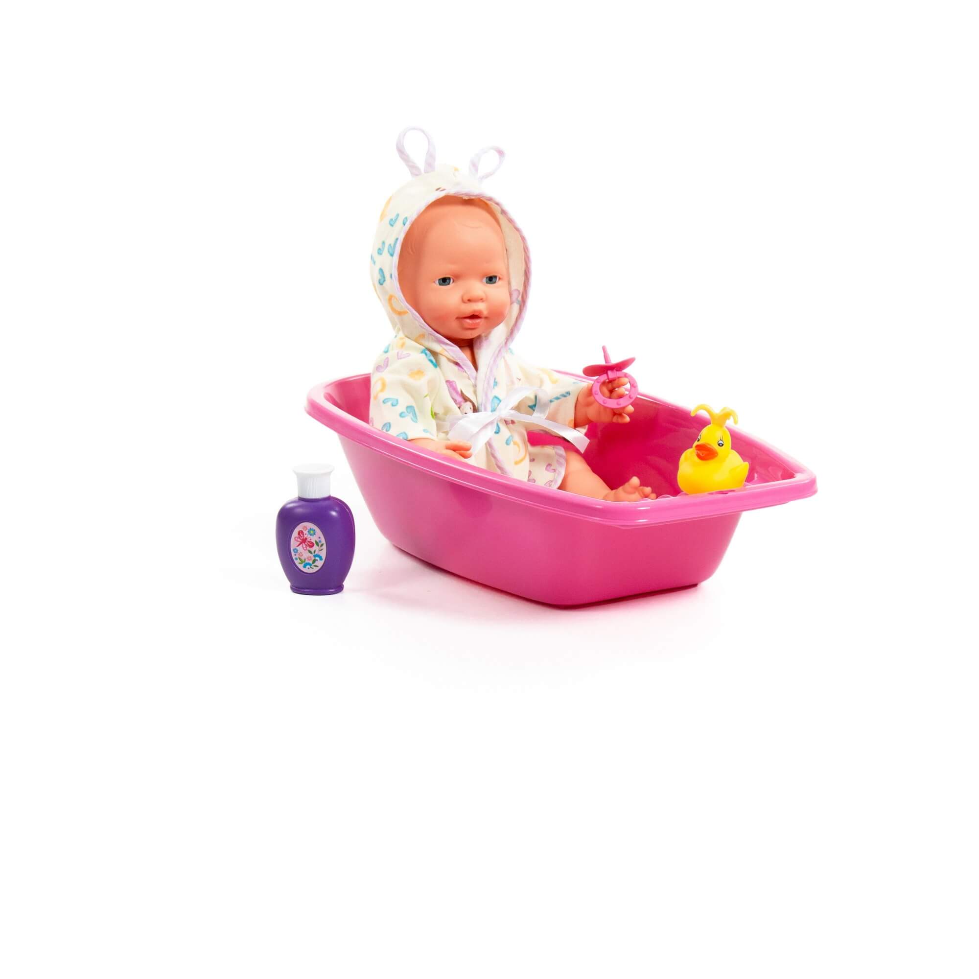 Милый пупс от фабрики «Полесье». Игрушка выполнена из качественного пластика. Имеет подвижные ручки и ножки, глазки не закрываются. В комплекте с пупсом идут соска и набор для купания, состоящий из резиновой уточки и флакончика, имитирующего средство для купания малышей. Одет малыш в стильный халатик с ушками.